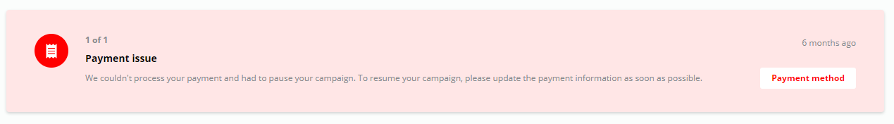 If you campaign is running as a subscription, and there is a problem with your card, you will get a notification about it. When this happens your campaign is paused automatically and your ads are not shown until you resolve the issue. To resume your campaign and resolve this issue, please update your payment information for the campaign as soon as possible.