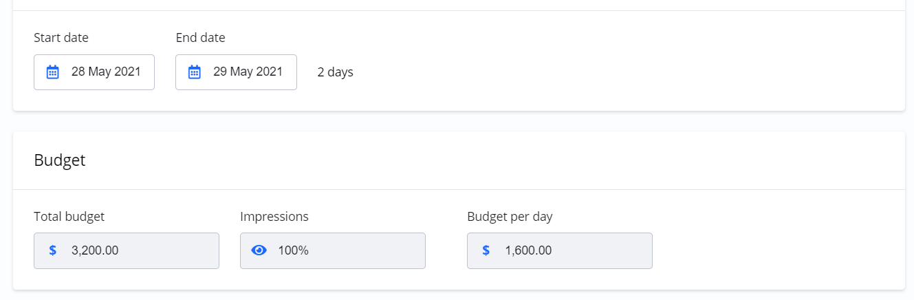 For campaigns where you buy a % of all available impressions, the number of days decides your budget. Here is an example of a CPD campaign with a price of $1,600 per day, running for two days.